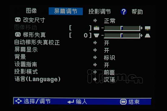 菜單設(shè)計(jì)感受:菜單依舊采用夏普投影機(jī)傳統(tǒng)的藍(lán)與白色調(diào)組合,個(gè)人較喜歡這個(gè)菜單。以RETURN和左方向鍵可實(shí)現(xiàn)返回上級(jí),ENTER進(jìn)入下級(jí);連續(xù)調(diào)節(jié)功能感應(yīng)好,速度快。