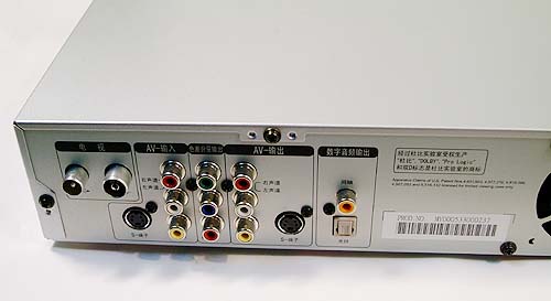 背部輸入輸出接口真是壯觀,一個天線輸入、一個天線輸出、一組包含S端子的AV輸入、一組包含S端子的AV輸出、色差輸出、光纖輸出和同軸輸出?赡芸紤]到錄像機的定位,飛利浦并沒有為這臺錄像機配備多聲道解碼器,如果需要使用多聲道效果的用戶可以使用光纖或者同軸輸出連接外置解碼器。