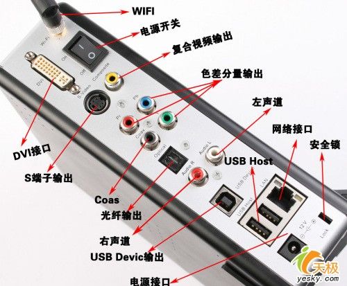 為了能夠得到更好更豐富的內(nèi)容上的支持,這款DMA高清播放器配備了比較豐富和完善的接口,包括高速的USB Host、WIFI等目前流行的模塊配置和接口,接下來就簡單的介紹下其接口。