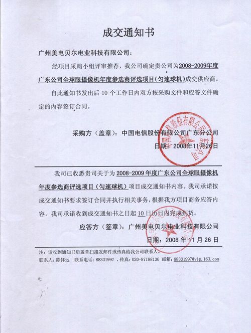 2008年11月26日,經(jīng)過(guò)項(xiàng)目采購(gòu)小組評(píng)審一致推薦,美電貝爾公司被確定為2008-2009年度廣東公司全球眼攝像機(jī)年度參選商評(píng)選項(xiàng)目指定供應(yīng)商。這是繼美電貝爾被評(píng)為“平安城市建設(shè)推薦優(yōu)秀安防產(chǎn)品”又一佳績(jī)。