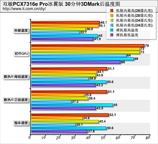 持續(xù)運行3DMark05三十分鐘后,顯卡溫度有明顯提升,不過從總體平均值來看,多數(shù)居于40~50度范圍內,由于雙敏這款顯卡背面有巨型散熱片,所以在內置機箱時候風道相當受益,甚至比起在外置機箱時候溫度有所下降,幅度相當明顯。從實際使用角度上來看,速配PCX7316e PRO冰翼版對于7300LE和DDR3顯存發(fā)熱控制,完全游刃有余,熱管的介入能夠在很大程度上將顯卡的正背面溫度適當平衡,從散熱片正背面溫度可以看到,他們的總體差異不大,U-Cool6冰翼熱管散熱器棱角分明的設計對于增加顯卡表面散熱面積和提升散熱效能有相當?shù)膸椭娘@卡右上角的電感處錄得的52.1攝氏度整體最高溫度,可以看到顯卡的整體熱量已經(jīng)聚積在這一位置,希望雙敏在后續(xù)產(chǎn)品上能夠加強這一電感散熱效能。