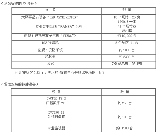 Panasonic在北京奧運會7座城市的37個比賽場館中投入的設備規(guī)模預計是雅典奧運會的1.7倍,是歷屆贊助規(guī)模最大的一次。其中包括大屏幕顯示設備“LED ASTROVISION”、專業(yè)音響系統(tǒng)“RAMSA”系列、包括等離子電視“VIERA”在內(nèi)的電視、DVD刻錄機“DIGA”,為大會的運營工作做出貢獻。特別是在舉行開閉幕式的國家體育場(鳥巢),龐大的 “LED ASTROVISION”大屏幕配合著專業(yè)音響系統(tǒng)“RAMSA”,能夠?qū)⒏咂焚|(zhì)的畫面和音效傳遞到場館的每個角落。除此之外,Panasonic還為北京市提供高畫質(zhì)、高敏感度的監(jiān)視、安防系統(tǒng),為奧運會的安心·安全運營提供支持。