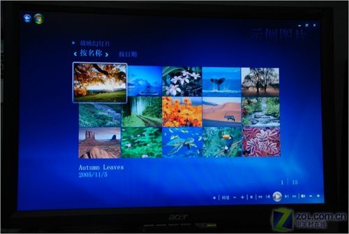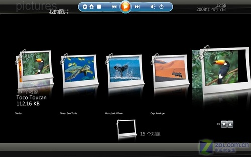 WMC與i媒體中心都能對(duì)常見的圖片格式很好的支持,但是WMC的界面與效果要比i媒體中心來的酷和流暢(如圖4、5)。