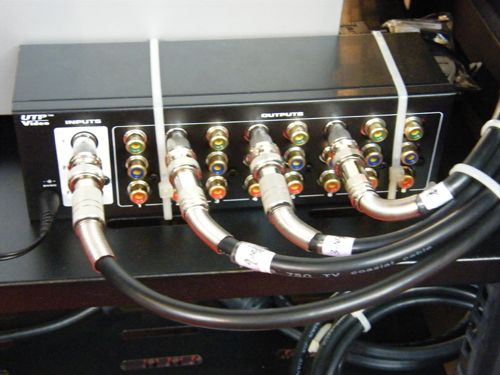 我們利用一個(gè)攝像機(jī)作為視頻信號(hào)源,將這一路視頻進(jìn)入一個(gè)視頻分配器UTP558Y得到兩路完全相同的視頻信號(hào),其中一路直接進(jìn)入一臺(tái)TCL監(jiān)控器,另一路通過(guò)優(yōu)特普雙絞線傳輸器傳輸1000米后進(jìn)入另一個(gè)同意型號(hào)的TCL監(jiān)控器。