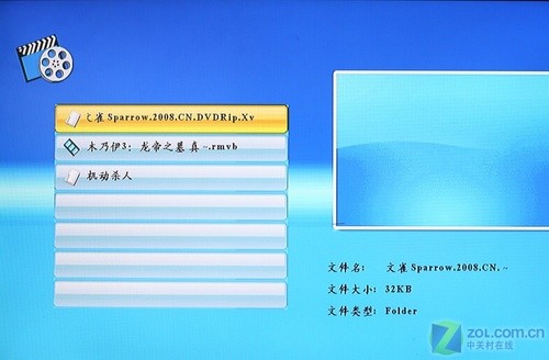 上圖是電影播放菜單的截圖,在選擇響應(yīng)的影片之后,右側(cè)的小屏幕中會播放影片的預(yù)覽,這個功能對文件管理比較混亂的存儲器尤其適用,這里要提醒您的是如果有子文件的話機器不能直接篩選讀取,需要進入子菜單選擇。