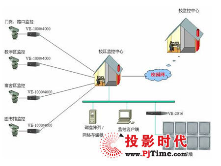 在校區(qū)監(jiān)控中心,可以利用PC式監(jiān)視器對(duì)前端監(jiān)控點(diǎn)的圖像實(shí)時(shí)監(jiān)控,也可以利用卓揚(yáng)科技多路視頻解碼器VE2004、VE2016,將以太網(wǎng)傳輸過(guò)來(lái)的圖像進(jìn)行解碼,接入模擬監(jiān)視器或者電視墻進(jìn)行監(jiān)控。