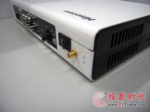 海信“E頻道”MC788H的附件配置并不復(fù)雜。其中具有特殊性的是一個小小的黑色天線。該天線被安裝于機(jī)器的后部,用來提高無線網(wǎng)絡(luò)信號的接受能力。下圖即為安裝了無線天線的效果圖。