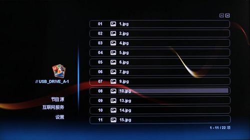 IPDVD Mini-1080P的圖片菜單較為簡單,沒有縮略圖預覽,點擊相應的圖片文件條就可以瀏覽圖片,在瀏覽過程中能夠設置圖片自動更換時間。
