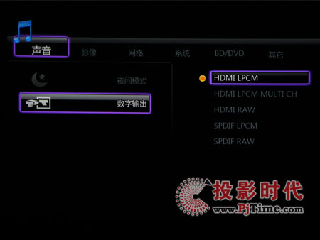 另一項(xiàng)數(shù)字輸出選項(xiàng)提供了5種音頻輸出方式,HDMI LPCM為本機(jī)解碼HDMI輸出2聲道音頻,可直接連接電視使用;HDMI LPCM MULTICH為多聲道音頻源碼輸出,搭配多聲道家庭影院;HDMI RAW用于連接次時(shí)代功放,由功放完成解碼;SPDIF LPCM為本機(jī)解碼后由光纖輸出到功放;SPDIF RAW為光纖輸出源碼至功放進(jìn)行解碼。
