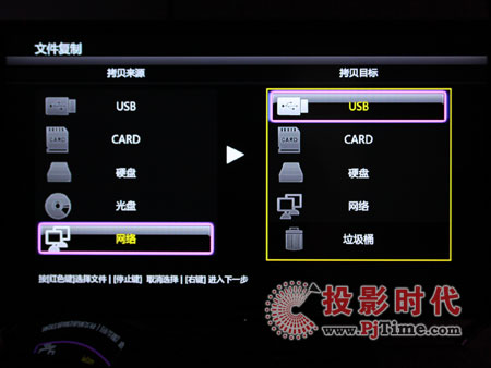 HD300D主菜單提供了常見(jiàn)的電影、音樂(lè)、圖片、文件復(fù)制及設(shè)置菜單。前三項(xiàng)主要用于相關(guān)媒體類(lèi)型文件的播放,文件復(fù)制菜單則是HD300D提供的一項(xiàng)貼心的功能。用戶(hù)可以將存儲(chǔ)設(shè)備中的文件復(fù)制到其他設(shè)備中,而無(wú)需借用電腦。如下圖。