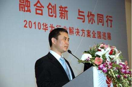 圖為華為中國(guó)區(qū)行業(yè)市場(chǎng)總裁陸雋在2010行業(yè)全國(guó)巡展啟動(dòng)儀式中致辭