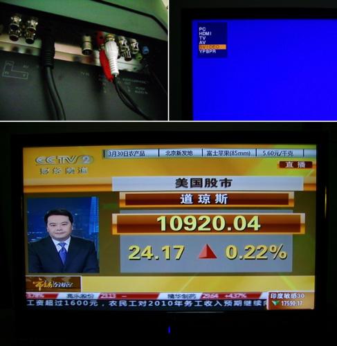 先接上S-Video視頻端子,進(jìn)入VP2431菜單選擇相應(yīng)信號(hào)來源,接下來就可以用VP2431看電視羅,屏幕上正在直播CCTV財(cái)經(jīng)頻道的市場分析節(jié)目。備注:對(duì)于視覺效果每個(gè)人的感受不同,加上咱家的拍攝環(huán)境、器材和拍攝技術(shù)所限,因此阿基獅在此不對(duì)屏幕畫質(zhì)進(jìn)行評(píng)價(jià),還請(qǐng)見諒羅~