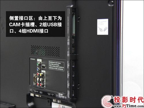 其中側(cè)面設(shè)計(jì)有數(shù)字電視卡槽、USB、HDMI接口,底部LAN網(wǎng)絡(luò)端口、電腦接口、音頻輸入、光纖接口、有線/天線接口、AV接口等,背面為RS-232接口、分量輸入、AV輸入。