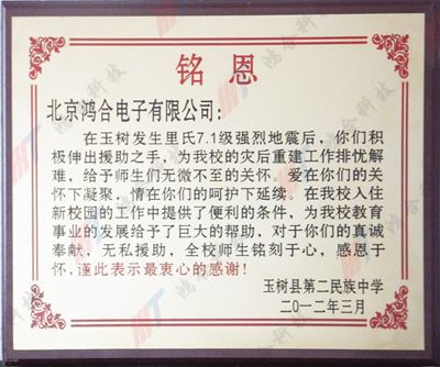 圖片說明:玉樹縣第二民族中學(xué)特別頒發(fā)的“銘恩牌”
