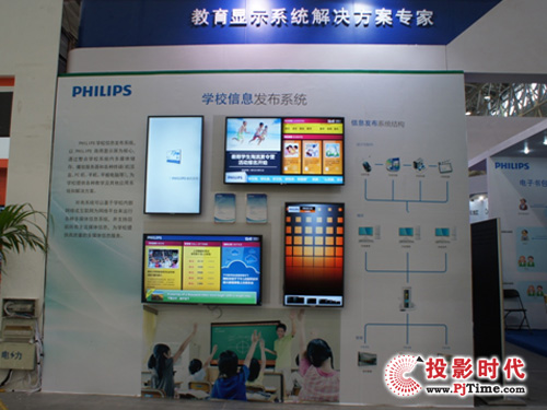 飛利浦針對(duì)學(xué)校各種各樣、不同年段、班級(jí)信息發(fā)布多,內(nèi)容各不相同的特點(diǎn),設(shè)計(jì)了獨(dú)特的飛利浦校園信息發(fā)布系統(tǒng)是其中一個(gè)典型例子。在展會(huì)現(xiàn)場(chǎng),該系統(tǒng)由2臺(tái)BDL4652EL,2臺(tái)5551EL,共4臺(tái)商用顯示屏拼成一個(gè)首尾相接的特殊藝術(shù)造型,吸引了不少觀眾。
