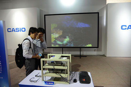 本方案使用卡西歐XJ-M255投影機兩臺,配合鏡頭前安裝的3D偏振片以及3D眼鏡,可以收看到立體效果非常出色的3D影像。