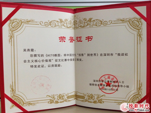 由深圳市工商聯(lián)在全市范圍內(nèi)舉辦的以”我談社會主義核心價值”為主題的征文攝影及”紅段子”比賽已經(jīng)圓滿結束。雅圖吳燕霞撰寫的《ACTO雅圖:將中國文化“投影”到世界》從一百多篇參賽作品中脫穎而出獲得“我談社會主義核心價值觀”征文比賽三等獎。