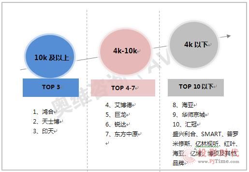 2014年一季度,平板式IWB市場(chǎng)TOP10品牌銷售量占比 79.4%;希沃、鴻合、長(zhǎng)虹在銷量和銷額排名中穩(wěn)居TOP3。投影式IWB市場(chǎng)中,TOP10品牌銷售量占比達(dá)90.6%,品牌集中度越來越高。其中鴻合、天士博、印天分居TOP3,三家公司總銷量份額達(dá)58.8%。