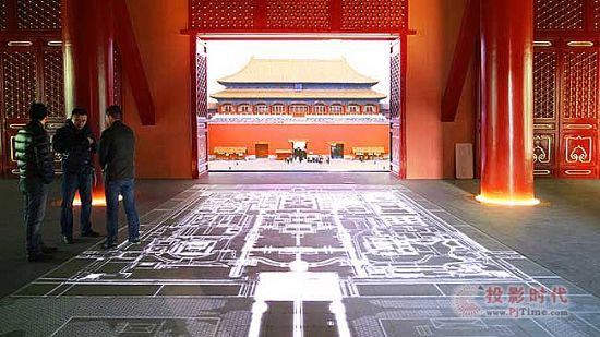 中央“主題體驗(yàn)”區(qū)用數(shù)字媒體與古典建筑融合的講述從紫禁城到博物院的前世今生。高分辨率地面屏幕、室內(nèi)定位系統(tǒng)、可調(diào)透明度成像玻璃以及集成控制的20臺(tái)投影機(jī)使觀眾可以 “凌空”走在紫禁城上空,透過十余扇數(shù)字大門了解故宮不同的空間地點(diǎn)以及歷史時(shí)段。