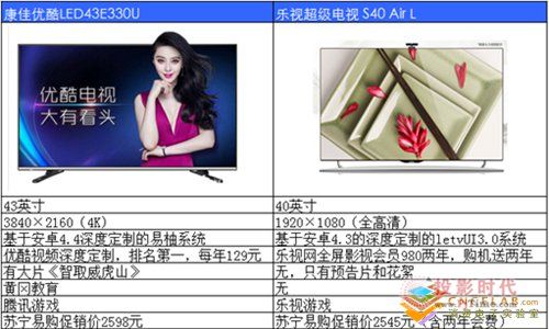 在本次評(píng)測(cè)中,我們引入了競(jìng)品對(duì)比環(huán)節(jié);谖覀?cè)凇皩懺谇懊娴脑挕敝械呐袛唷N覀兲暨x了互聯(lián)網(wǎng)超級(jí)電視的代表性品牌樂(lè)視與傳統(tǒng)電視制造業(yè)代表康佳進(jìn)行客觀碰撞。因?yàn)椋瑯?lè)視沒(méi)有43寸這個(gè)尺寸的產(chǎn)品,我們選擇了樂(lè)視TV 同一級(jí)別的超級(jí)電視 S40 Air L全配版進(jìn)行比對(duì)。需要說(shuō)明的是我們此次做的并不是對(duì)比評(píng)測(cè),因?yàn)閷?duì)比評(píng)測(cè)要嚴(yán)格選用同一尺寸的電視進(jìn)行對(duì)比,所以競(jìng)品PK只是進(jìn)行一些主要指標(biāo)的客觀對(duì)比,以其提高評(píng)測(cè)的可讀性。