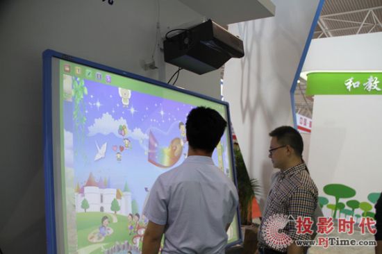 此次展示的激光超短焦互動(dòng)教學(xué)系統(tǒng)同樣引來(lái)了諸多觀眾的駐足體驗(yàn)。該系統(tǒng)同樣采用純激光光源,分辨率達(dá)1280×800,亮度為3600LM,光源壽命2萬(wàn)小時(shí),對(duì)比度13000:1,JBMA均勻度可達(dá)90%以上,在傳統(tǒng)白板基礎(chǔ)上為教學(xué)領(lǐng)域又提供了一個(gè)全新的選擇。