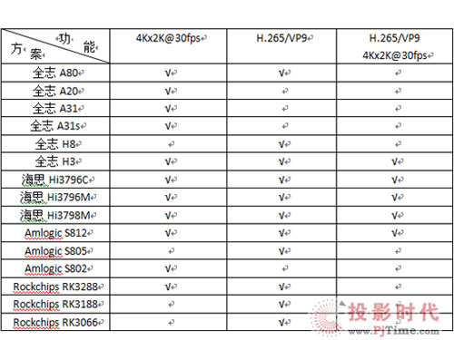 在此,我們也針對目前智能盒子領(lǐng)域所常用的處理芯片進行了整理,下面將列出不同處理芯片所對應(yīng)的硬解能力,因處理器供應(yīng)商技術(shù)不斷進步,以下數(shù)據(jù)僅供參考。