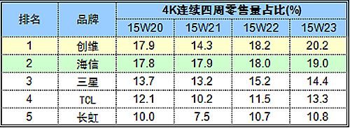 第23周的數(shù)據(jù)顯示,創(chuàng)維4K份額以20.2%占據(jù)行業(yè)第一,海信、三星分別以19.0%和14.4%位列二、三位。