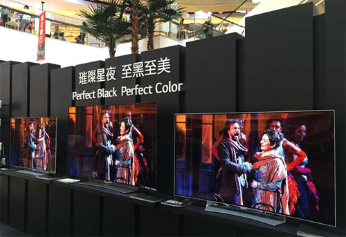 此次LG活動還特別設(shè)有LG OLED電視和4K液晶電視的對比展示區(qū),在現(xiàn)場我們看到,當(dāng)OLED電視和4K液晶電視同時播放黑色畫面時,走入純黑環(huán)境中時根本看不到OLED電視的存在,仿佛消失了一般。而一旁的4K液晶電視則泛著灰蒙的光亮,能明顯看到機(jī)身的存在。之所以會出現(xiàn)這樣的情況是因為,LG OLED電視首次拋卻了背光源,實(shí)現(xiàn)了有機(jī)像素點(diǎn)自發(fā)光。LG OLED電視(4K分辨率)屏幕上3300萬個子像素點(diǎn)獨(dú)立控制,在播放黑色畫面時能使像素點(diǎn)直接關(guān)閉,這就實(shí)現(xiàn)了與黑夜般的環(huán)境融為一體的卓越黑色。