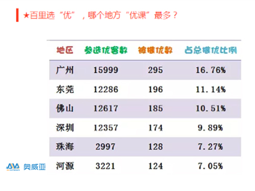 目前,東莞市已建成近100間奧威亞優(yōu)課錄播系統(tǒng)及微課制作室。AVA錄播系統(tǒng)為東莞市優(yōu)課、微課等活動(dòng)的開展提供強(qiáng)大的技術(shù)支持。AVA錄播系統(tǒng)的一鍵式操作,讓老師們輕松實(shí)現(xiàn)優(yōu)課的錄制。在廣東省各地級(jí)市推優(yōu)截止前,東莞市通過(guò)AVA錄播系統(tǒng)共曬優(yōu)課12286節(jié),曬課總數(shù)排全省第五位。廣東省內(nèi),東莞被推選的優(yōu)課數(shù)量?jī)H次于廣州,位居第二。東莞被推選的省級(jí)優(yōu)課數(shù)為196節(jié),占全省總推優(yōu)比例的11.14%。這些錄制好的優(yōu)課視頻有助于教師間互相學(xué)習(xí),也可幫助學(xué)生進(jìn)行課前預(yù)習(xí)、課中學(xué)習(xí)、課后復(fù)習(xí)等。