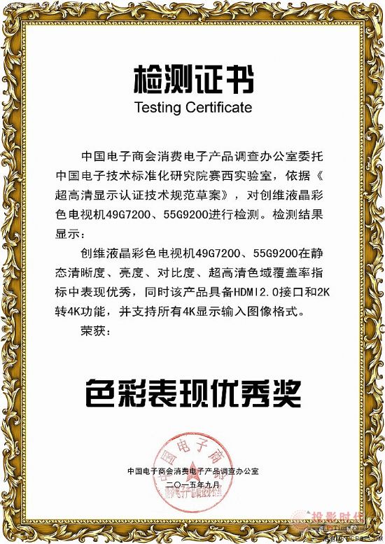現(xiàn)如今,4K已成為中高端電視的普遍配置,但有些品牌的電視雖然使用了4K面板,但在接口、芯片、視頻解碼等方面不足,不能顯示真正4K清晰度。經(jīng)中國(guó)電子技術(shù)標(biāo)準(zhǔn)化研究院賽西實(shí)驗(yàn)室檢測(cè),創(chuàng)維送檢的兩款電視49G7200和55G9200在靜態(tài)清晰度、亮度、對(duì)比度、超高清色域覆蓋率等指標(biāo)中表現(xiàn)優(yōu)秀,同時(shí)具備HDMI 2.0接口和2K轉(zhuǎn)4K功能,并支持所有4K顯示輸入圖像格式,榮獲“色彩表現(xiàn)優(yōu)秀獎(jiǎng)”。