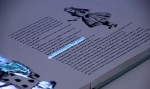 通過編程設計,索尼使得它的原型能夠感知英國作家路易斯·卡羅爾(Lewis Carroll)的經(jīng)典作品《愛麗絲奇境記》。在該公司的代表打開那本書之后,書上會出現(xiàn)動畫,而且你可以將它們從頁面上移出來,將其與附近的實體物體進行交互,如茶碗和撲克牌。該臺面還可以通過追蹤你的手的方向來響應任何的指壓動作,而在臺面任何區(qū)域的上方懸停你的手指,則可以凸顯投影儀用以監(jiān)測你的移動的光柵。