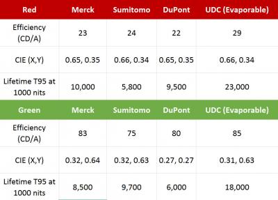 默克表示,印刷材料與蒸鍍OLED的差距已經(jīng)被拉近,下表是OLED協(xié)會在2016年發(fā)布的對照表: