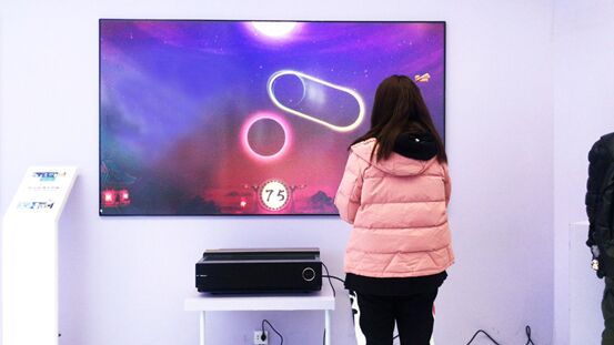 在科技探索區(qū),海信4K激光電視100L7助陣騰訊最新推出的線下沉浸式實景體驗游戲《晴夢》,通過完美的視覺呈現(xiàn),帶領(lǐng)玩家感受中國傳統(tǒng)文化魅力。海信100L7 系列激光電視是全球首家實現(xiàn)了真正的雙色激光顯示,BT.709標(biāo)準(zhǔn)下色域達(dá)到160%,保證了用戶能夠看到比液晶電視更豐富的色彩、更真實的畫面。漫反射成像,觀看更加舒適護(hù)眼,可以大大降低玩家的視覺疲勞度。海信L7系列激光電視攜手全球頂級音響品牌哈曼卡頓,聯(lián)合開發(fā)蜂巢仿生音響系統(tǒng),蜂巢仿生音響系統(tǒng)采用陣列式排布設(shè)計,能呈現(xiàn)游戲中最完美的音質(zhì)效果,帶領(lǐng)玩家體驗最真實的游戲環(huán)境。