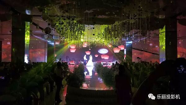 全息投影固然少不了投影機(jī)的功勞,根據(jù)不同的婚禮現(xiàn)場(chǎng)和設(shè)置不同,激光投影因地制宜,助力營(yíng)造出夢(mèng)幻的沉浸體驗(yàn),有的采用拼融投影打造主舞臺(tái)巨幅沙幕影像,有的用側(cè)墻壁超寬幅投影畫面烘托氣氛。