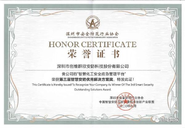 創(chuàng)維群欣的“智慧化工安全應(yīng)急管理平臺”榮獲第三屆智慧安防優(yōu)秀解決方案獎。