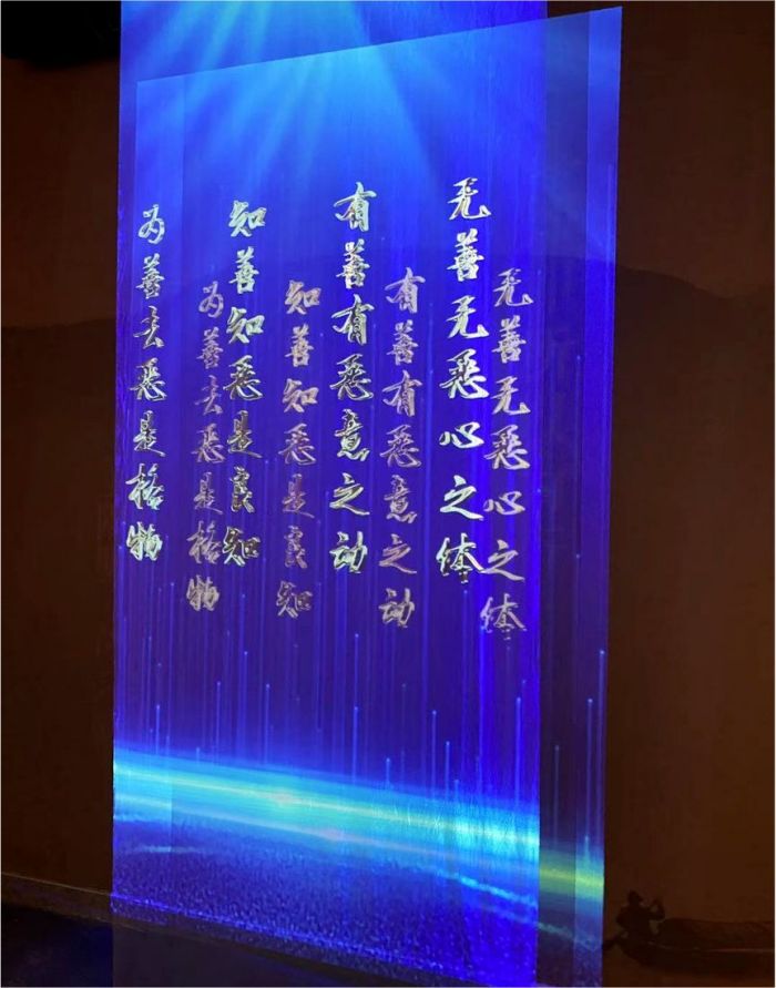 非遺項目背負著時代的印記與城市的溫度,更凝聚著市民對這方土地、這座城市的情感。新館的五大展廳帶領市民找尋城市文化之根、城市精神之源,意猶未盡之時,意境靜美的尾廳為這場非遺之旅畫上一個完滿的句點。只見思想家王陽明先生置身片片水色輕紗之間,誦著四訣,諄諄講授著水鄉(xiāng)孕育的心學理念:“心即理,知行合一,致良知”“山近月遠覺月小,便道此山大于月”……3臺6000流明的PT-BAZ602C松下液晶投影機點亮紗幕,博大昌達的思想絮絮流淌,觀者離去時仿佛仍沉浸在柯橋文化當中,“余音”繞梁。