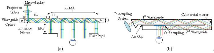 基于斯涅爾折反射定律的宏觀光學(xué)解決方案經(jīng)歷了從傳統(tǒng)光學(xué)解決方案到自由棱鏡和幾何光波導(dǎo)解決方案的轉(zhuǎn)變,顯著提高了AR-HMD系統(tǒng)的成像質(zhì)量和緊湊性。自由曲面棱鏡的使用有效地?cái)U(kuò)展了視場(chǎng),減少了傳統(tǒng)光學(xué)元件的使用。平面光波導(dǎo)進(jìn)一步減小了系統(tǒng)的體積和重量。