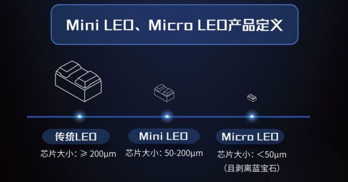 當(dāng)前,Mini/Micro LED芯片的尺寸已朝百微米級(jí)以下發(fā)展。一般的傳統(tǒng)LED芯片大于200μm,Mini LED芯片約為50-200μm,而Micro LED芯片則更會(huì)微縮至小于50μm。