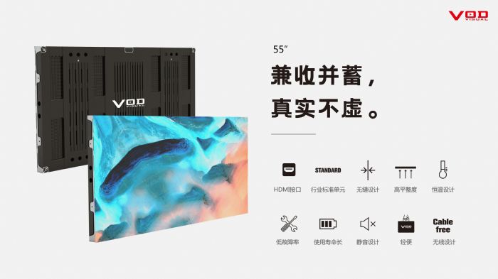 沃頓55寸LED標(biāo)準(zhǔn)面板是業(yè)內(nèi)首款55寸單體壓鑄鋁箱體的全彩色LED直顯屏。此款產(chǎn)品秉承了沃頓科技一向的完全前維護(hù)、硬連接、無風(fēng)扇靜音設(shè)計(jì)等特點(diǎn),并集合了高刷、低亮高灰以及沃頓自有的VOD畫質(zhì)引擎,顯示畫質(zhì)優(yōu)異,完美替代55寸液晶屏的安裝及使用,專用于戶內(nèi)小間距LED顯示屏應(yīng)用領(lǐng)域。