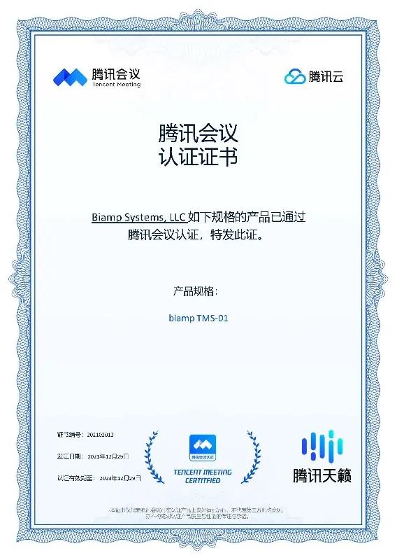日前,天創(chuàng)集團核心合作伙伴Biamp的會議室解決方案得到騰訊會議認證并獲得了證書,會議室解決方案包括天花話筒套裝與桌面話筒套裝。Biamp會議室解決方案搭配騰訊會議Rooms提供真正非凡的溝通與無與倫比的輕松管理。