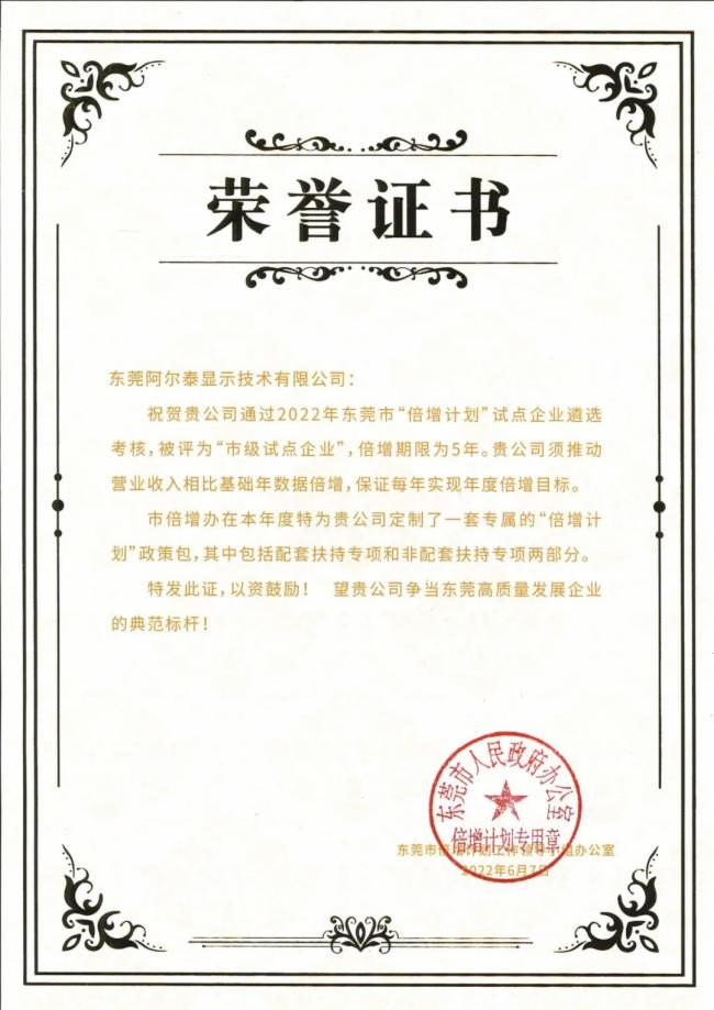 AET阿爾泰被評為東莞市倍增計(jì)劃市級試點(diǎn)企業(yè)