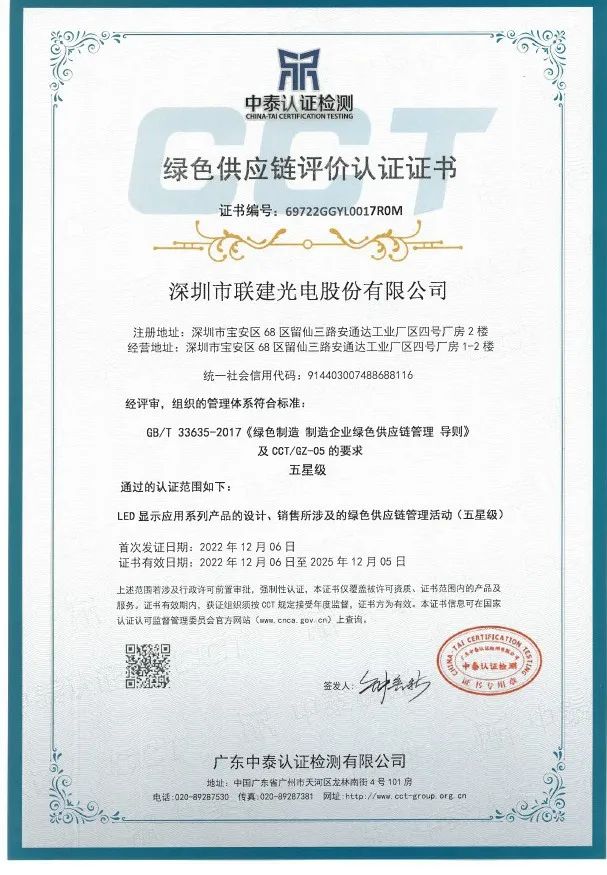 綠色供應(yīng)鏈可以為中國出口企業(yè)提供一個“變綠”的運動場,幫助中國企業(yè)改善能源和資源利用效率,降低污染排放水平,縮減生產(chǎn)和管理成本。目前,聯(lián)建光電已經(jīng)積極響應(yīng)國家“雙碳”環(huán)保的發(fā)展戰(zhàn)略,是業(yè)內(nèi)少數(shù)開啟綠色供應(yīng)鏈認證的企業(yè),不僅有綠色供應(yīng)鏈體系認證證書,還獲得了溫室氣體核查認證證書、碳中和承諾示范單位、碳足跡核查證書等多種綠色認證證書,聯(lián)建光電打造的綠色供應(yīng)鏈體系,不僅是保護環(huán)境,也是企業(yè)社會責任感的體現(xiàn)。增強企業(yè)的競爭力提高整個供應(yīng)鏈的效益的同時,也可規(guī)避綠色技術(shù)貿(mào)易壁壘,保證產(chǎn)品的出口優(yōu)勢。