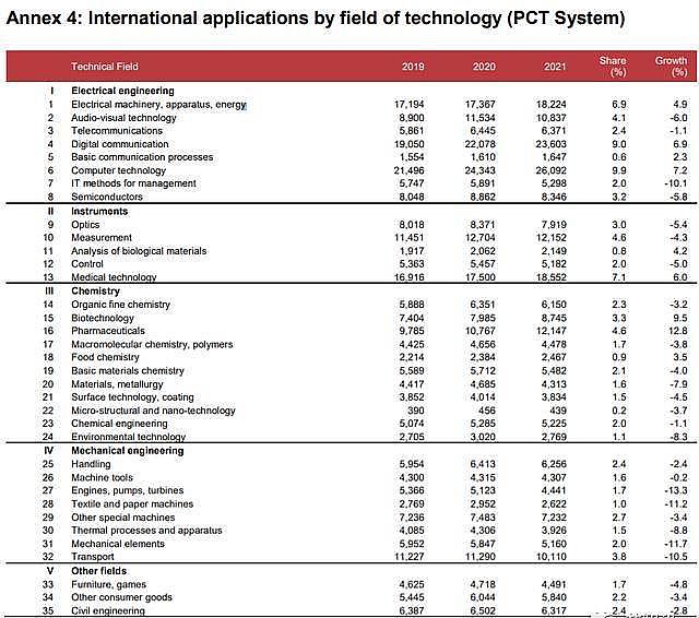 其次,數(shù)字通信(9%),醫(yī)療技術(shù)(7.1%),電機(6.9%)和測量(4.6%)。從PCT專利申請量在各種技術(shù)領(lǐng)域的角度來看,前10個技術(shù)領(lǐng)域的六個區(qū)域在前10個技術(shù)領(lǐng)域保持了增長,其中藥物領(lǐng)域增加了最快(+ 12.8%),其次是生物技術(shù)( + 9.5%),計算機技術(shù)(7.2%)和數(shù)字通信(+ 6.9%)。這些領(lǐng)域的增長證明,隨著Covid-19流行差的傳播和數(shù)字技術(shù)的延續(xù)機遇,健康相關(guān)技術(shù)取得了快速發(fā)展。