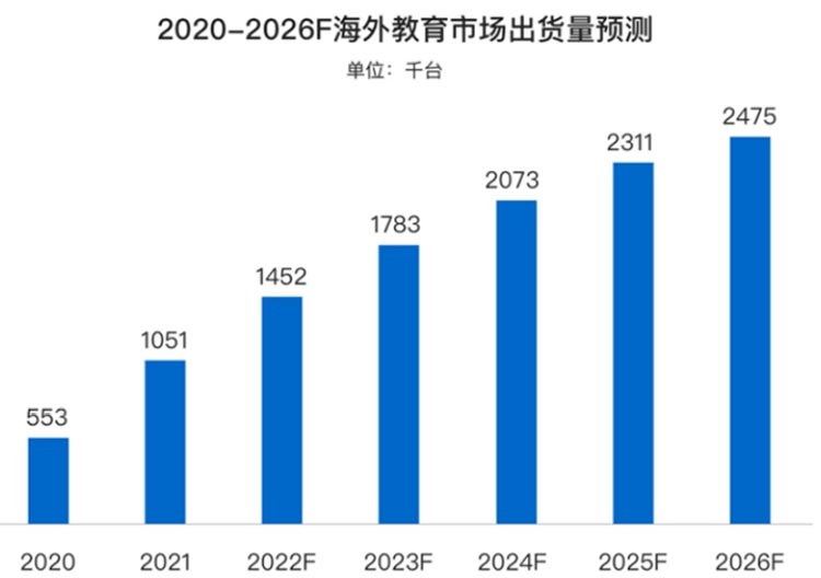 中國的教育信息化當前已經走在了全世界前列,依據(jù)迪顯咨詢的報告顯示,截至2020年底,教育市場交互智能平板在中國的滲透率為59%,而在全球的滲透率僅為14%。近年來,歐美國家正逐步完善教育信息化建設,交互智能平板的需求增速持續(xù)提升。隨著全球各主要經濟體在教育信息化領域的引領與發(fā)展,發(fā)展中國家近些年也不斷出現(xiàn)國家級政府主導的教育信息化建設項目,整個海外教育市場對交互智能平板產品的需求潛力巨大。依據(jù)迪顯咨詢的報告顯示,2021年海外教育市場交互智能平板的出貨量為105.1萬臺,增速為90%,未來5年海外教育市場交互智能平板的預估復合增長率為19%。