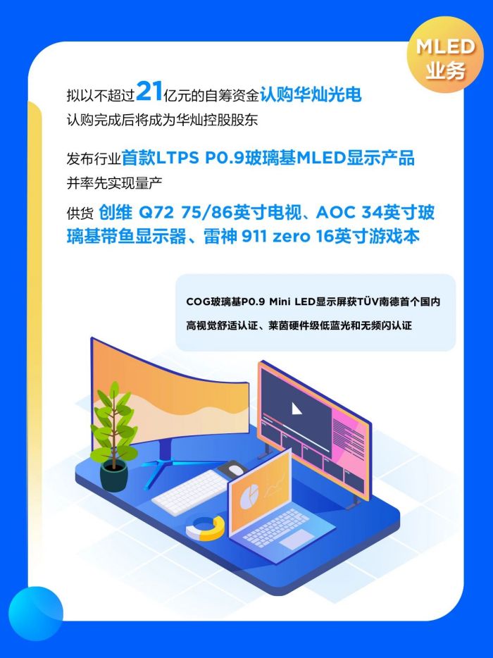 產(chǎn)品、技術(shù)、產(chǎn)業(yè)布局多領(lǐng)域取得突破,報告期內(nèi)實現(xiàn)營收約8.47億元,同比增長約84.79%。直顯COG P0.9、COB P0.9~1.5全系列產(chǎn)品實現(xiàn)多家品牌客戶量產(chǎn),LTPS技術(shù)實現(xiàn)箱體點亮并送樣;背光車載項目成功導(dǎo)入國內(nèi)新能源客戶4.82寸Mini項目,VR 2.48寸、5.46寸項目順利量產(chǎn)交付,86英寸玻璃基主動式驅(qū)動Mini LED 產(chǎn)品榮獲SID DIA大獎—2022年度最佳顯示組件獎;布局上游,高效整合核心生態(tài)資源,有力夯實產(chǎn)業(yè)領(lǐng)先優(yōu)勢。