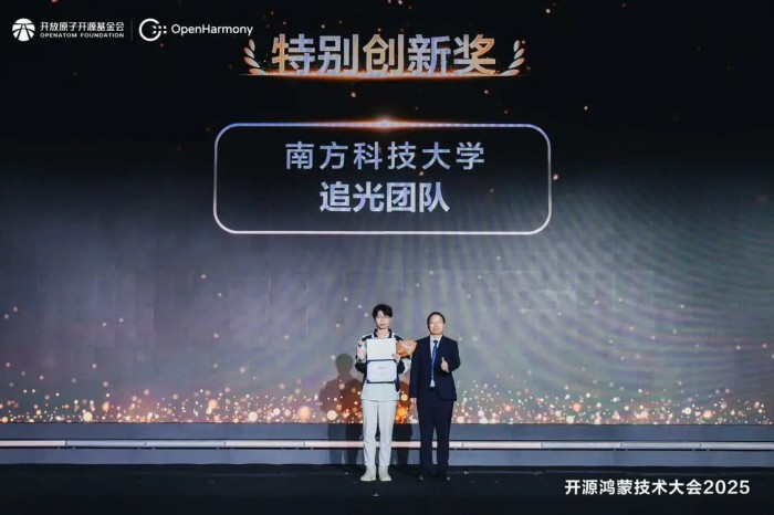 開源鴻蒙項(xiàng)目群技術(shù)指導(dǎo)委員會主席陳海波為獲獎(jiǎng)賽隊(duì)頒發(fā)特別創(chuàng)新獎(jiǎng)