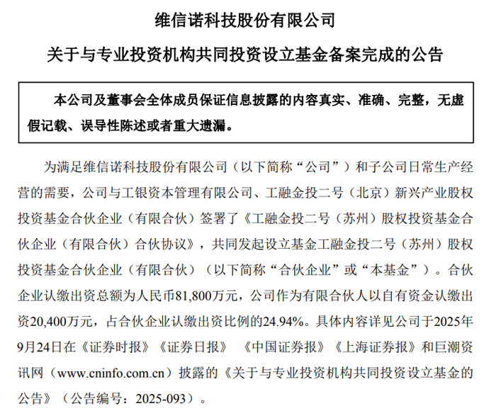 近日,維信諾科技股份有限公司(證券代碼:002387,證券簡(jiǎn)稱:維信諾)發(fā)布重要公告,其與工銀資本管理有限公司、工融金投二號(hào) (北京) 新興產(chǎn)業(yè)股權(quán)投資基金合伙企業(yè) (有限合伙) 共同發(fā)起設(shè)立的 “工融金投二號(hào) (蘇州) 股權(quán)投資基金合伙企業(yè) (有限合伙)”(以下簡(jiǎn)稱 “本基金”),已順利完成工商登記手續(xù)并取得營(yíng)業(yè)執(zhí)照,且于近日在中國(guó)證券投資基金業(yè)協(xié)會(huì)完成私募投資基金備案,標(biāo)志著該基金正式進(jìn)入運(yùn)作籌備階段。