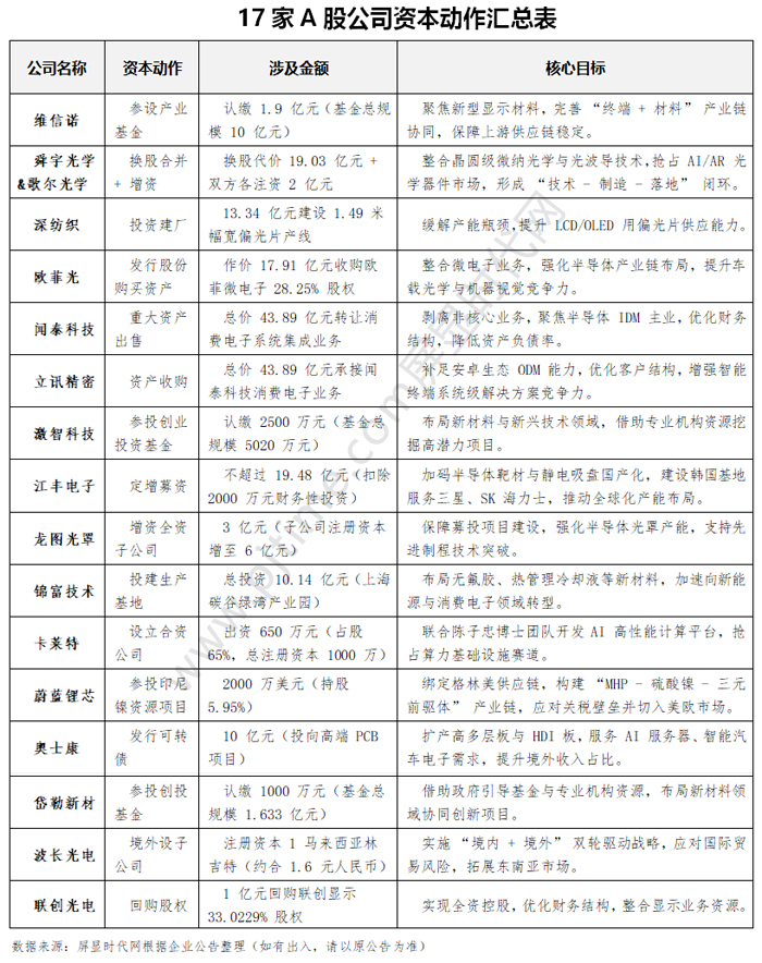 2025 年 10 月中旬,A 股資本市場迎來一波 “產(chǎn)業(yè) + 資本” 聯(lián)動熱潮。維信諾、聞泰科技、立訊精密、舜宇光學(xué)、歌爾光學(xué)、深紡織、聯(lián)創(chuàng)光電、波長光電、歐菲光、激智科技、江豐電子、龍圖光罩、錦富技術(shù)、卡萊特、蔚藍鋰芯、奧士康、岱勒新材等 17家上市公司集中披露投資、并購、海外設(shè)廠、定增募資等關(guān)鍵動作,涉及金額從數(shù)千萬元到數(shù)十億元不等,覆蓋新型顯示材料、AI/AR 光學(xué)器件、半導(dǎo)體核心材料、新能源鎳資源等多個高景氣賽道。