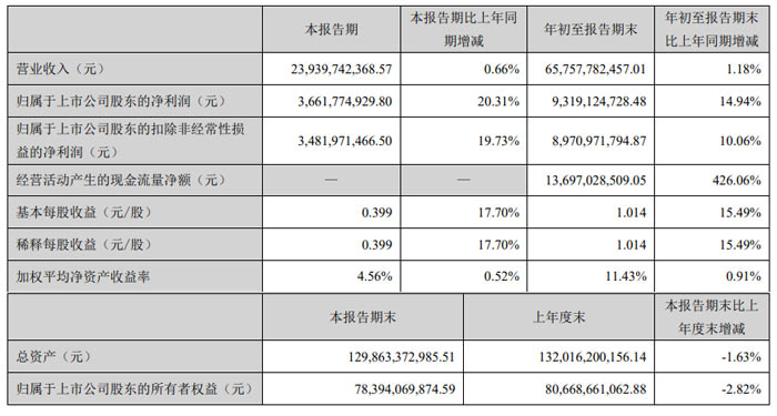 從年初至 9 月末的累計(jì)數(shù)據(jù)來看,公司整體經(jīng)營(yíng)韌性凸顯。累計(jì)實(shí)現(xiàn)營(yíng)業(yè)收入 657.58 億元(65,757,782,457.01 元),同比增長(zhǎng) 1.18%;累計(jì)歸屬于上市公司股東的凈利潤(rùn) 93.19 億元(9,319,124,728.48 元),同比增長(zhǎng) 14.94%;基本每股收益 1.014 元 / 股,同比增長(zhǎng) 15.49%,股東收益同步提升。