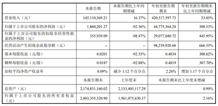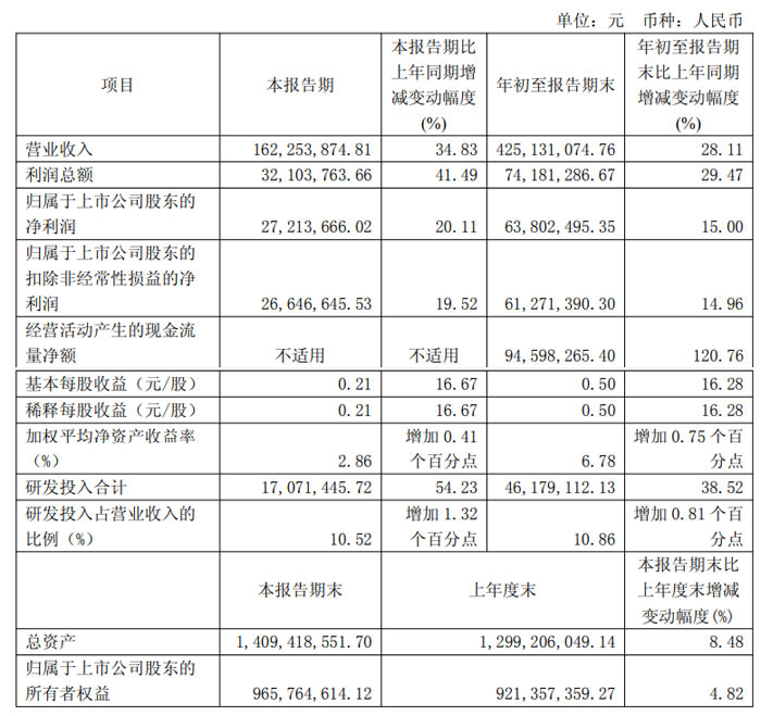 從年初至報(bào)告期末(1-9 月),公司累計(jì)業(yè)績(jī)同樣表現(xiàn)突出。累計(jì)實(shí)現(xiàn)營(yíng)業(yè)收入 4.25 億元,同比增長(zhǎng) 28.11%;累計(jì)歸母凈利潤(rùn) 6380.25 萬元,同比增長(zhǎng) 15.00%;基本每股收益 0.50 元 / 股,同比增長(zhǎng) 16.28%,加權(quán)平均凈資產(chǎn)收益率 6.78%,較上年同期增加 0.75 個(gè)百分點(diǎn)。